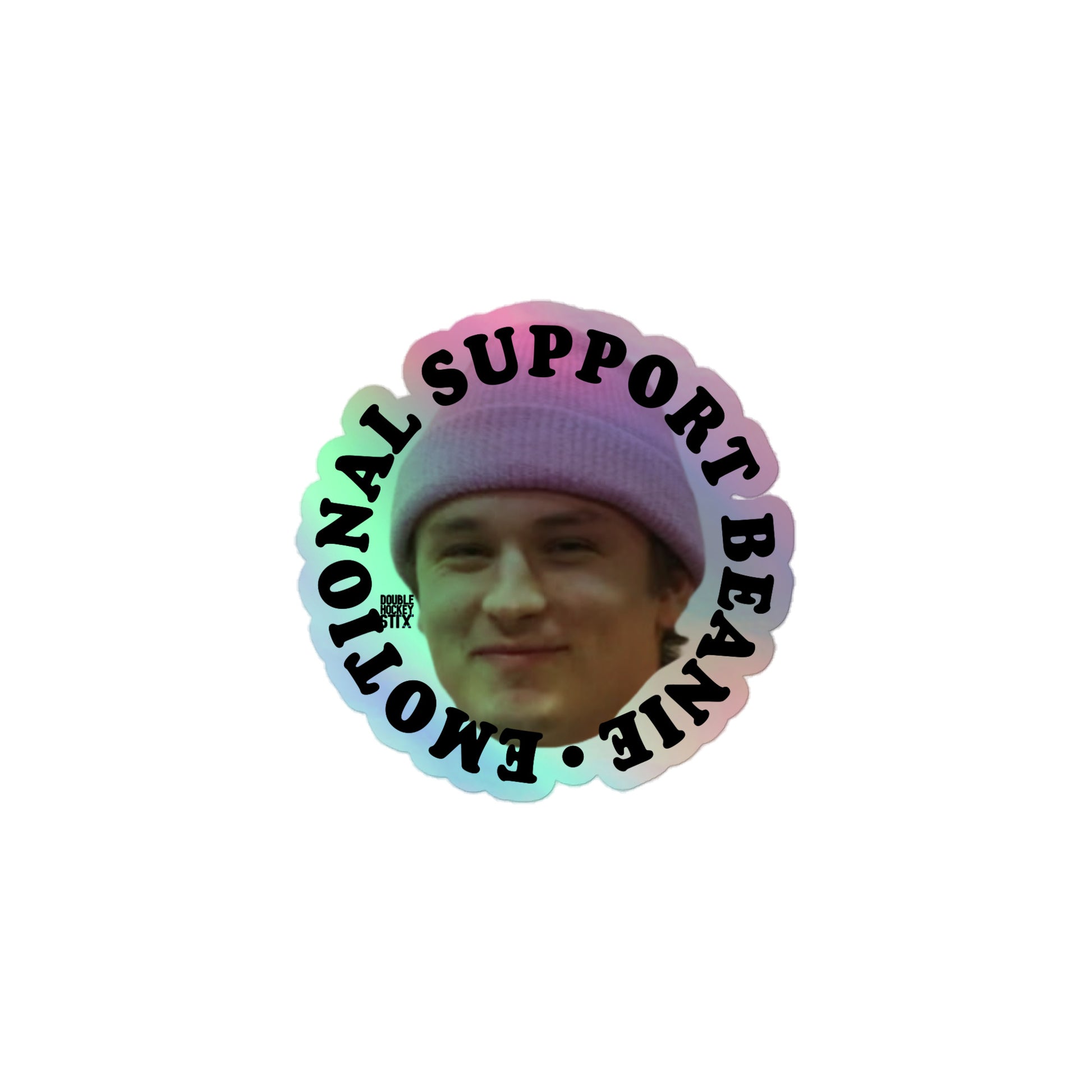 A MAN WITH HIS EMOTIONAL SUPPORT BEANIE. NO RELATIONSHIP IS MORE IMPORTANT. SUPPORT Z AND HIS EMOTIONS WITH THIS HOLOGRAPHIC STICKER.