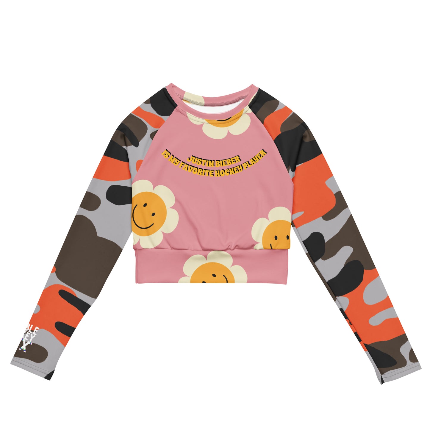 BABY, BABY, BABY, OH!! LET PEOPLE KNOW WHO YOUR FAV HOCKEY PLAYER IS WITH THIS MIXED RECYCLED MATERIAL LONG-SLEEVE CROP TOP. SUPER STRETCHY, SUPER SOFT.